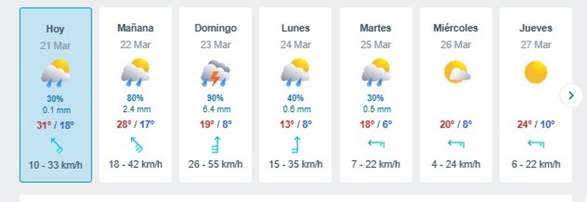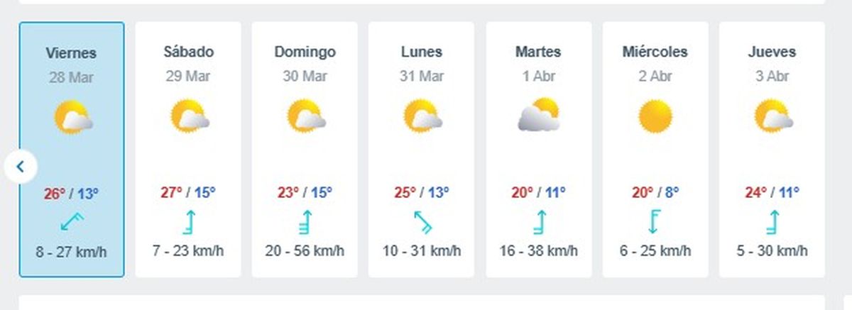 Así, a partir del viernes 28 de marzo, la temperatura vuelve a subir hasta ubicarse en el tope de 27°C que se espera para el sábado 29, el día más caluroso de fin de mes.