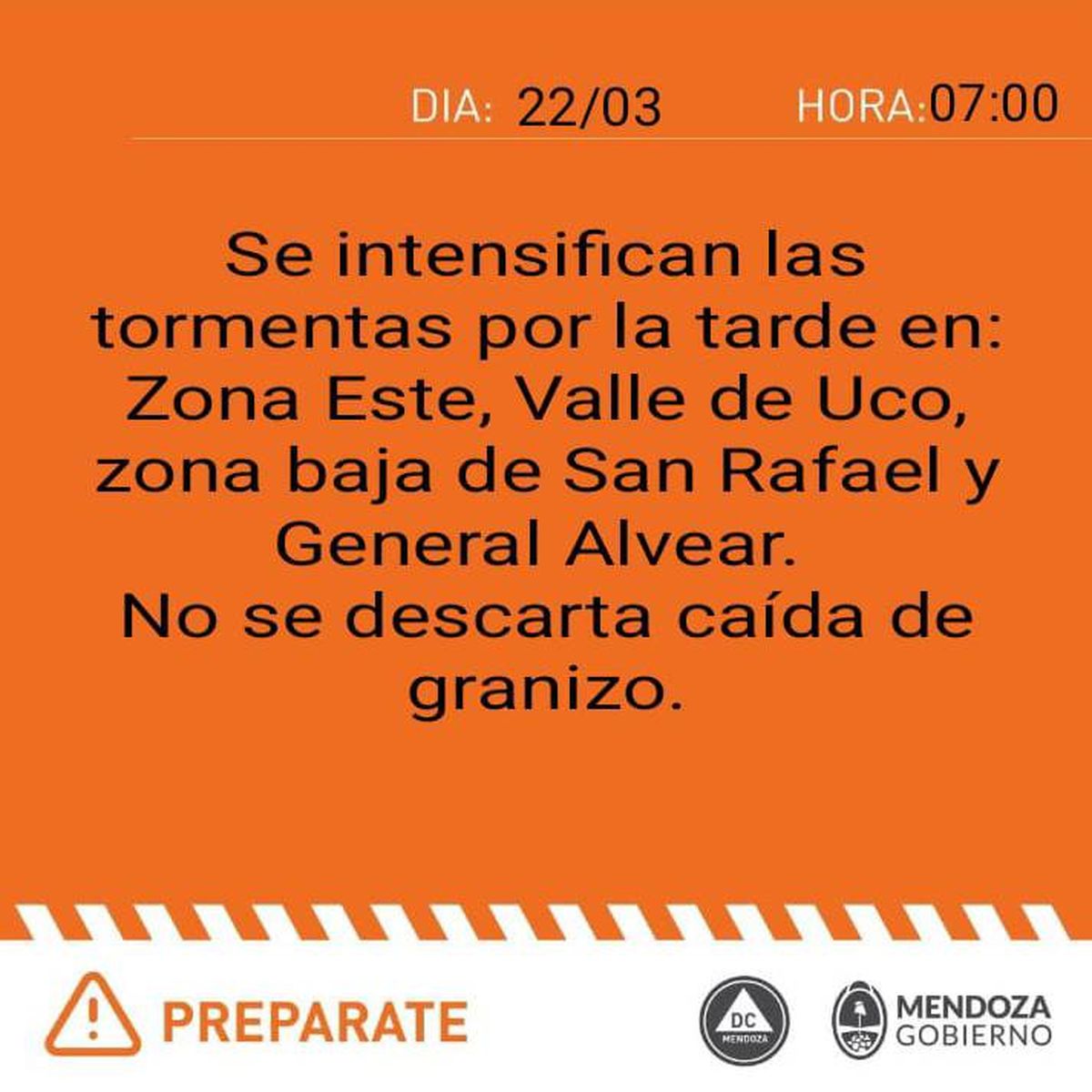 Para este sábado rige alerta naranja para varios departamentos de la provincia y no se descartó la posible caída de granizo, según el reporte de Defensa Civil.