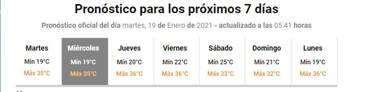 El miércoles la máxima también sería de 35 grados mientras que jueves y viernes llegaría a los 36 grados. Aunque el día estará parcialmente nublado.