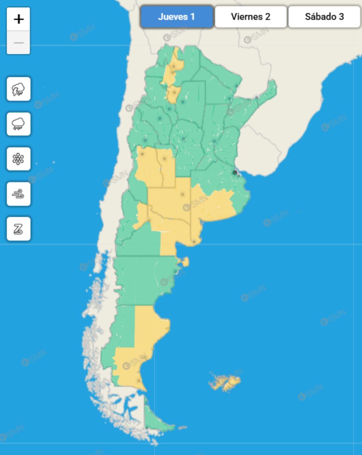 Por su parte, el Servicio Meteorológico Nacional emitió una alerta amarilla por posibles tormentas fuertes durante la tarde, a tono con lo que acontece en buena parte de la zona central del país, tal como se puede ver en el siguiente mapa: