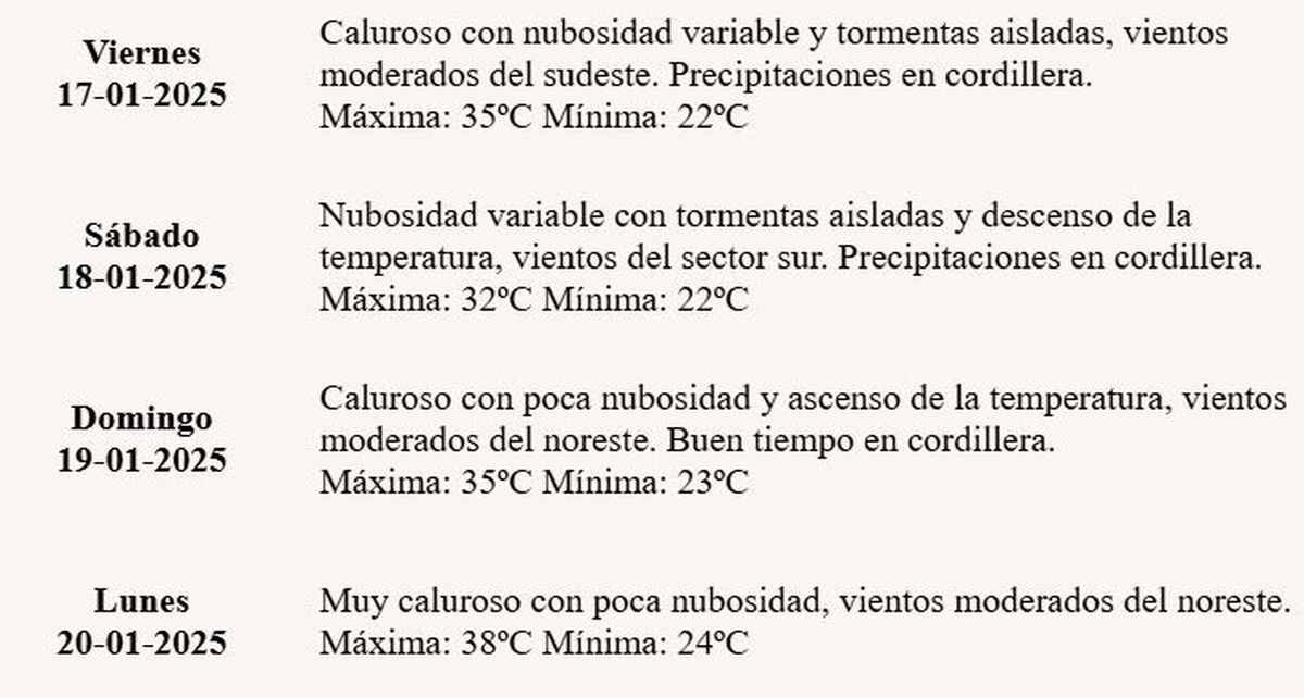 Este viernes, el pronóstico indica caluroso con nubosidad variable y tormentas aisladas, vientos moderados del sudeste. La máxima está pronosticada en 35°C, mientras que la mínima será de 22°C.