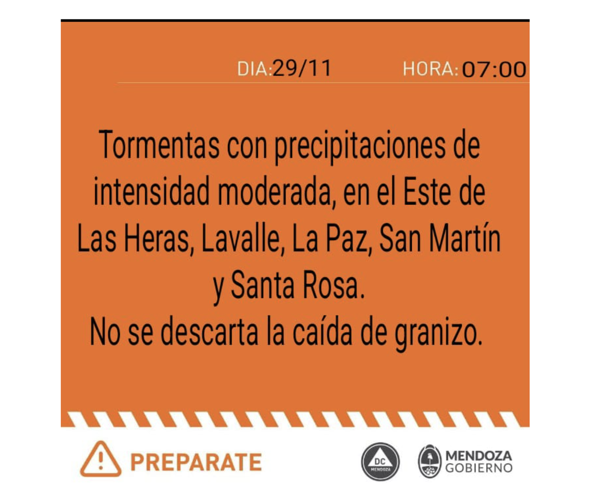 En este caso, desde Defensa Civil emitieron una alerta naranja por las lluvias de intensidad moderada en el Este de Las Heras, Lavalle, La Paz, San Martín y Santa Rosa. No se descartó la posibilidad de caída de granizo.