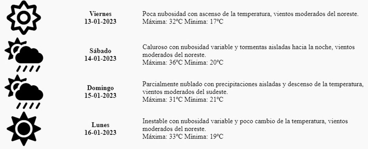 Sábado: Caluroso con nubosidad variable y tormentas aisladas hacia la noche, vientos moderados del noreste. Máxima: 36º Mínima: 20º