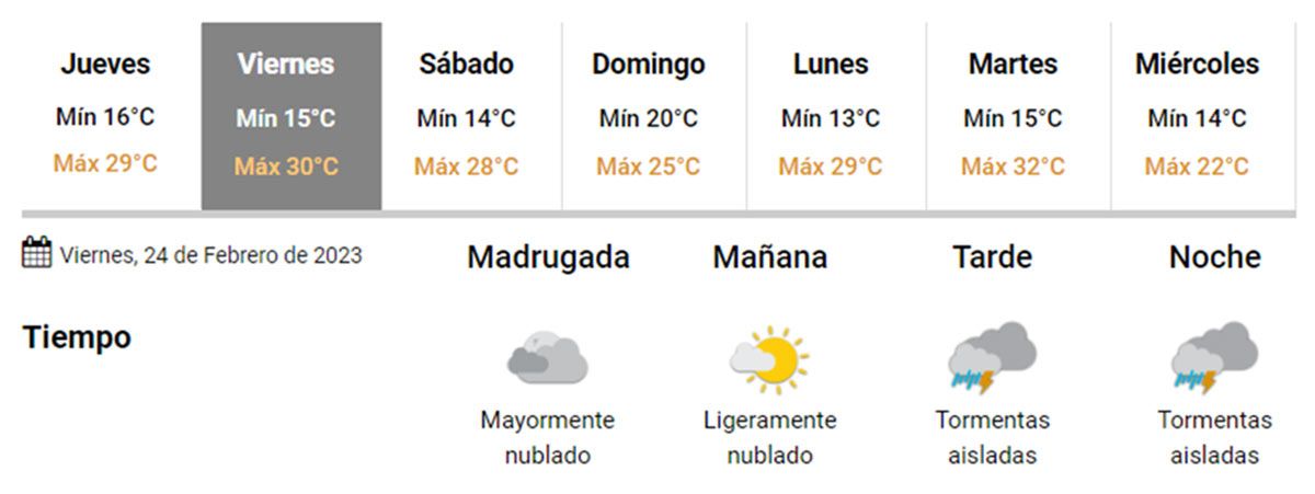 Entonces, el viernes el cielo estará ligeramente nublado por la mañana y se cerrará hacia la tarde y noche, con probabilidades de tormentas aisladas de hasta el 70%. La temperatura mìnima será de 14ºC y la máxima de 28ºC.