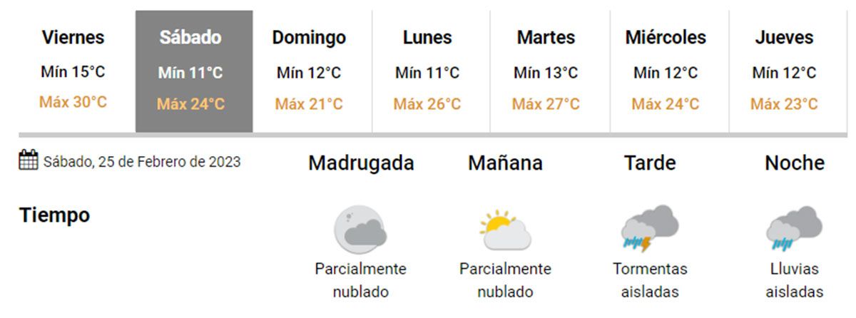 Entonces, el sábado el cielo estará parcialmente nublado por la mañana y se cerrará hacia la tarde y noche, con probabilidades de tormentas aisladas de hasta el 40%. La temperatura mìnima será de 11ºC y la máxima de 24ºC.