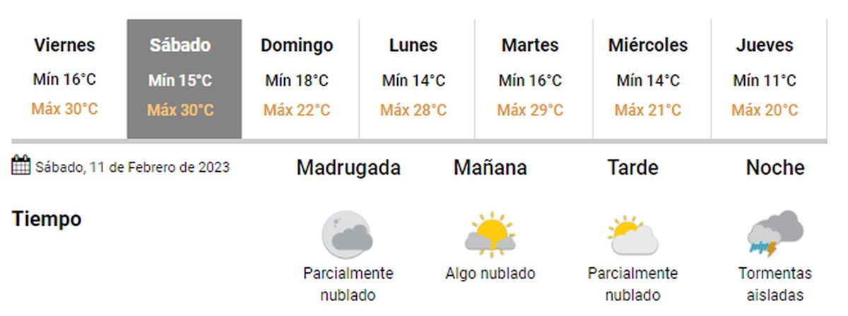 El cielo estará algo nublado durante la mañana y con escasa probabilidad de tormentas durante la tarde y noche. La temperatura mínima será de 15ºC y la máxima de 30ºC.