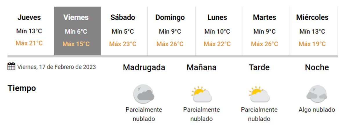 El cielo estará algo nublado, sin probabilidad de precipitaciones. La temperatura mínima será de 9ºC y la máxima de 26ºC.