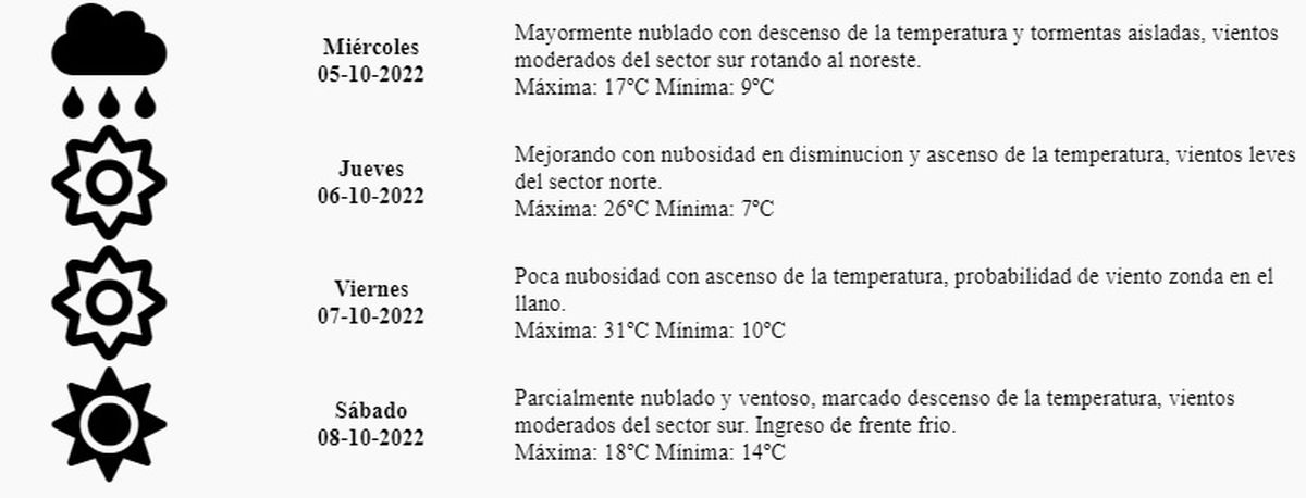 Miércoles: Mayormente nublado con descenso de la temperatura y tormentas aisladas, vientos moderados del sector sur rotando al noreste. Máxima: 17º Mínima: 9º