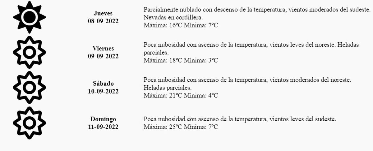Sábado: Poca nubosidad con ascenso de la temperatura, vientos moderados del noreste. Heladas parciales. Máxima: 21º Mínima: 4º