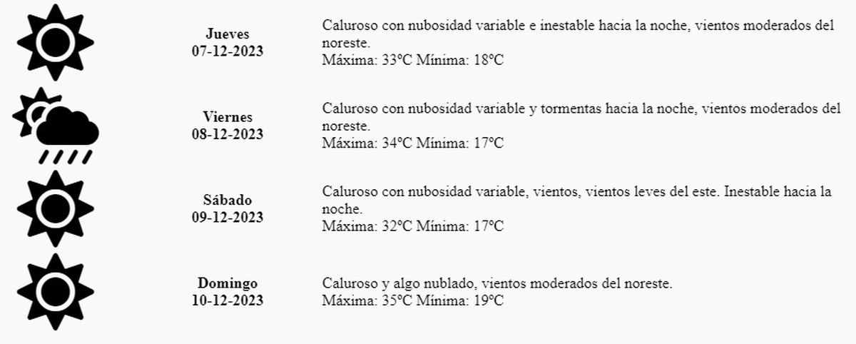 El viernes, en tanto, que será feriado por el Día de la Virgen de la Inmaculada Concepción, volverá a subir la temperatura, ya que la máxima trepara hasta los 34º, el cielo permanecerá con nubosidad variable, con vientos del noreste y con probables tormentas aisladas hacia la noche.