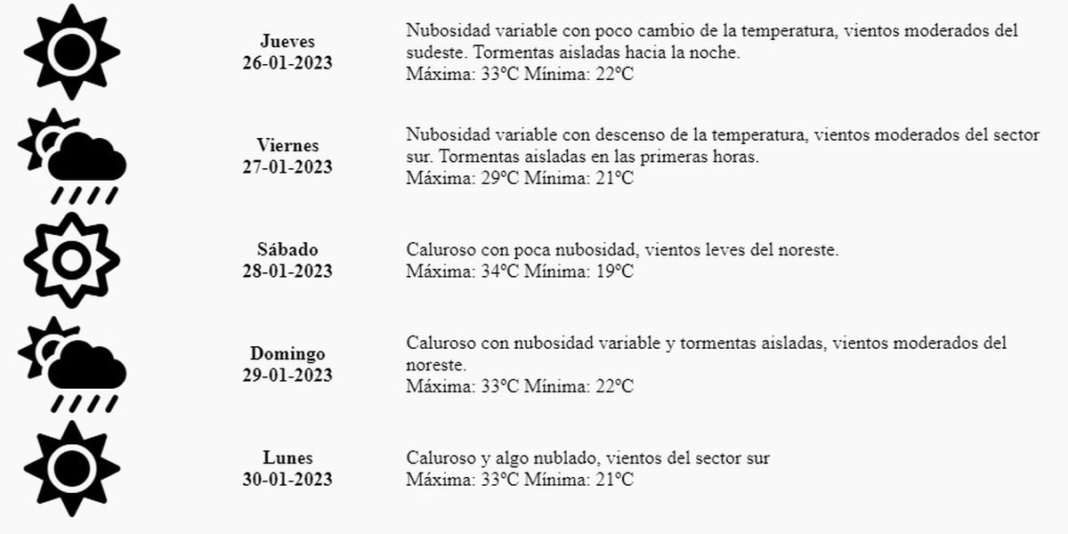 Jueves: Nubosidad variable con poco cambio de la temperatura, vientos moderados del sudeste. Tormentas aisladas hacia la noche. Máxima: 33º Mínima: 22º