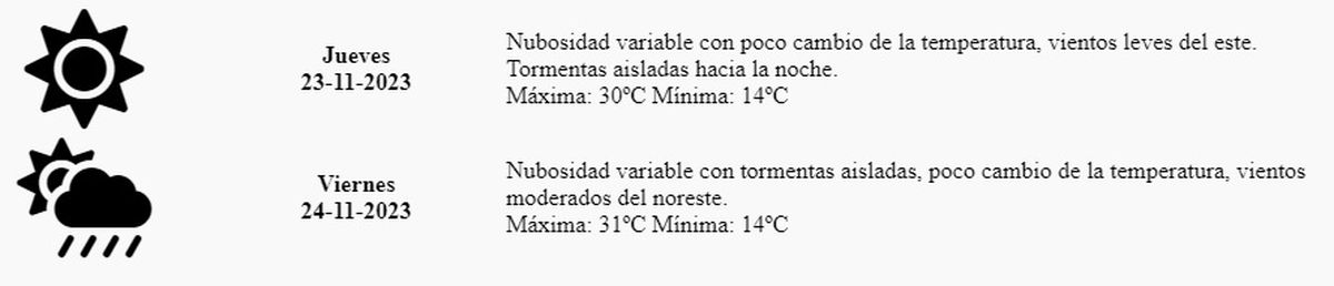 Jueves: Nubosidad variable con poco cambio de la temperatura, vientos leves del este. Tormentas aisladas hacia la noche. Máxima: 30º Mínima: 14º