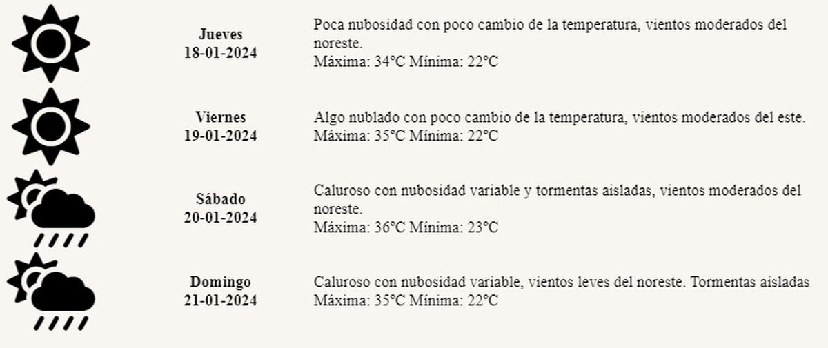 Sábado: Caluroso con nubosidad variable y tormentas aisladas, vientos moderados del noreste. Máxima: 36º Mínima: 23º