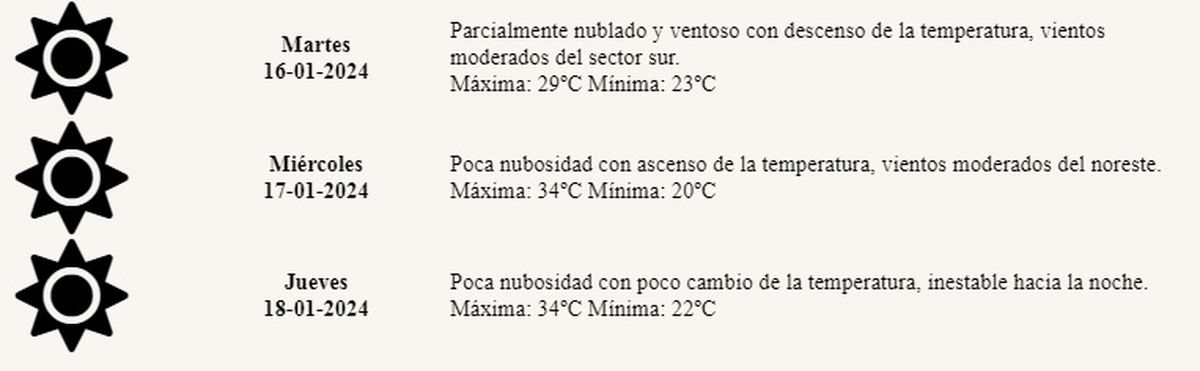 El miércoles volverá el tiempo caluroso, habrá ascenso de la temperatura, el cielo estará casi totalmente despejado, con vientos del noreste. La máxima llegaría a los 34º y la mínima de 20º.