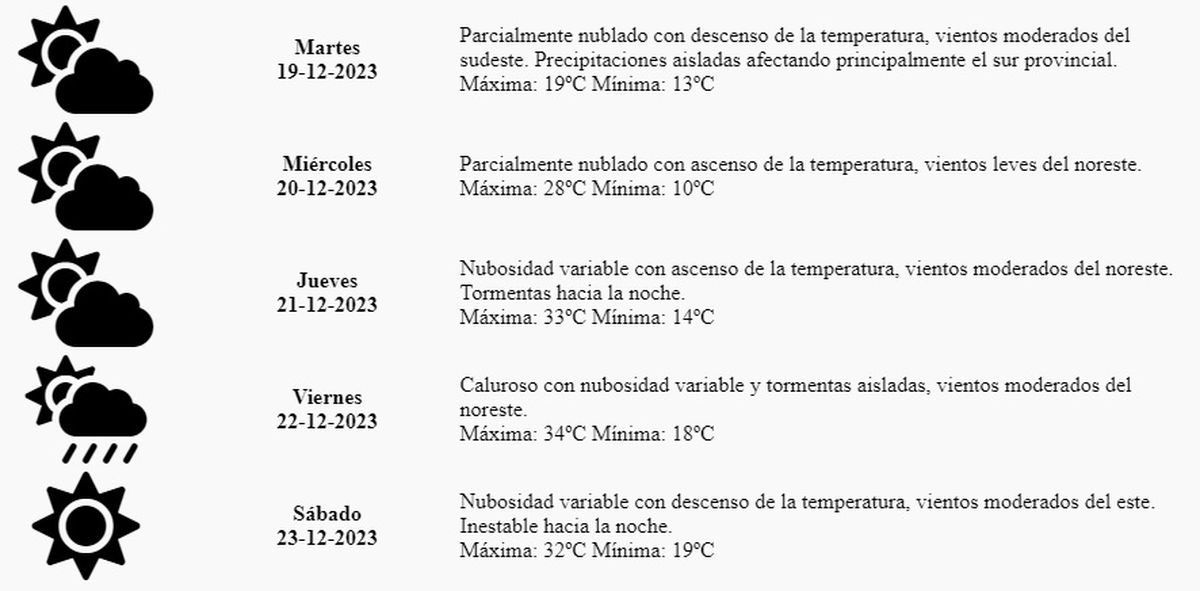 El pronóstico del tiempo para este martes indica "parcialmente nublado con descenso de la temperatura, vientos moderados del sudeste. Precipitaciones aisladas afectando principalmente el sur provincial", con una máxima probable de 19º y una mínima de 13º.