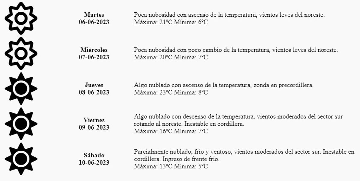 Martes: Poca nubosidad con ascenso de la temperatura, vientos leves del noreste. Máxima: 21º Mínima: 6º