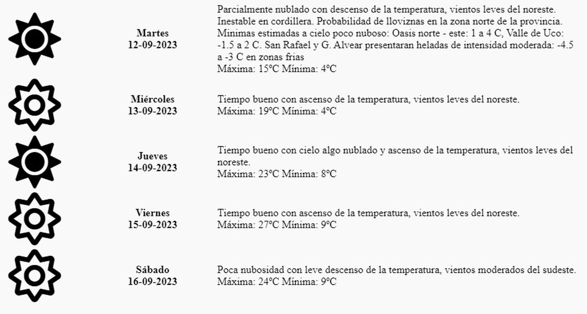 Martes: Parcialmente nublado con descenso de la temperatura, vientos leves del noreste. Inestable en cordillera. Probabilidad de lloviznas en la zona norte de la provincia. Máxima: 15º Mínima: 4º. Mínimas estimadas a cielo poco nuboso: Oasis norte - este: 1 a 4º, Valle de Uco: -1.5 a 2º. San Rafael y G. Alvear presentaran heladas de intensidad moderada: -4.5 a -3º en zonas frias.