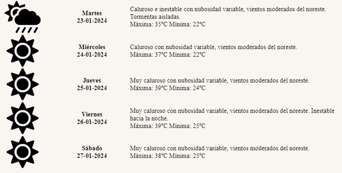Para el jueves en tanto, se espera una jornada agobiante, inestable, con humedad ambiental y una temperatura que alcanzará los 39º, al igual que el viernes, en que se mantendrán los 39º, aunque con inestabilidad y probabilidades de tormentas.