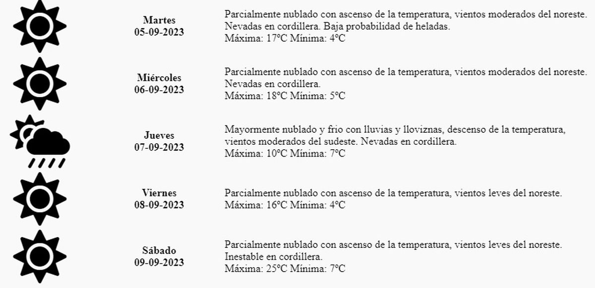 Martes: Parcialmente nublado con ascenso de la temperatura, vientos moderados del noreste. Nevadas en cordillera. Baja probabilidad de heladas. Máxima: 17º Mínima: 4º