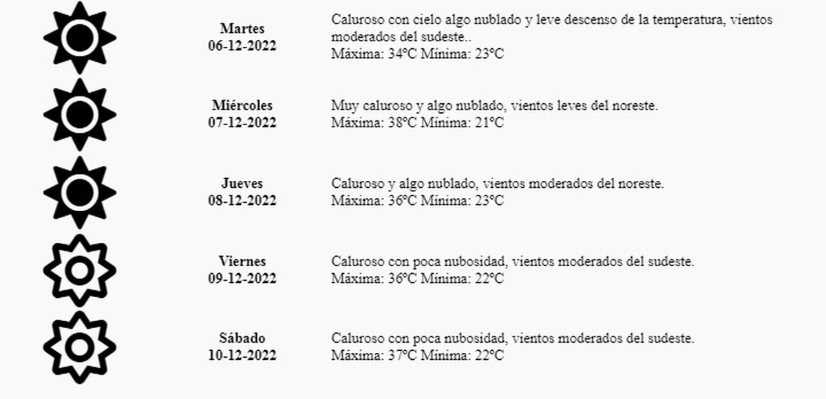 Miércoles: Muy caluroso y algo nublado, vientos leves del noreste. Máxima: 38º Mínima: 21º