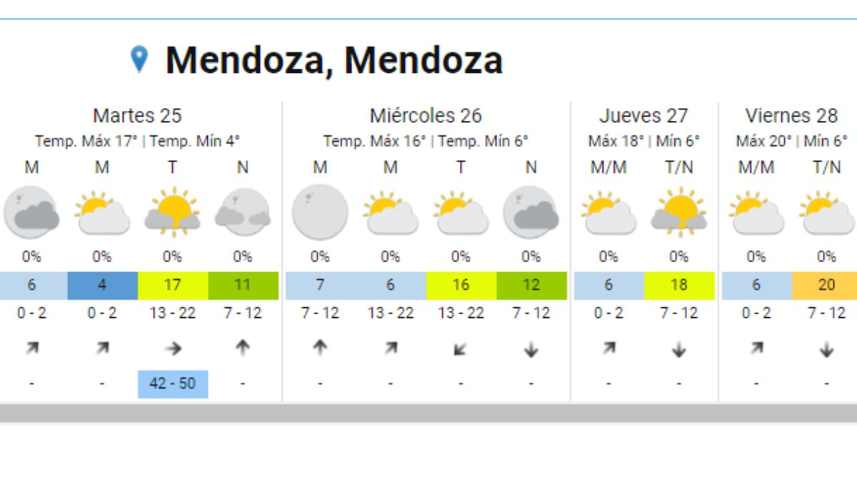 Este martes el cielo estará algo nublado, con una temperatura máxima: de 17º, y una mínima de 2º. El tiempo en Mendoza no tendrá muchos cambios hasta el viernes y seguirá presente la situación de viento Zonda.