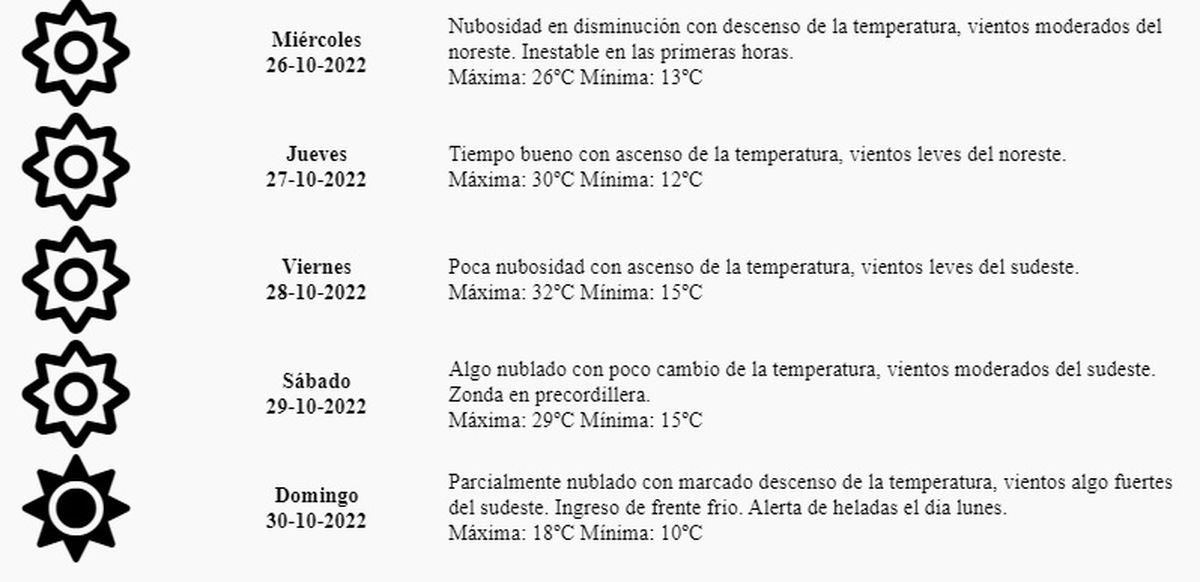 Viernes: Poca nubosidad con ascenso de la temperatura, vientos leves del sudeste. Máxima: 32º Mínima: 15º
