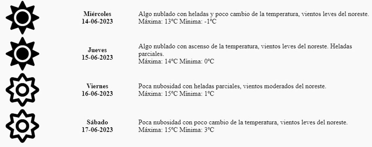 Miércoles: Algo nublado con heladas y poco cambio de la temperatura, vientos leves del noreste. Máxima: 13º Mínima: -1º