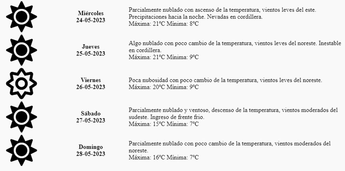 El pronóstico del tiempo para este miércoles anticipa "parcialmente nublado con ascenso de la temperatura, vientos leves del este. Precipitaciones hacia la noche. Nevadas en cordillera", con una máxima probable de 21º y una mínima de 8º.