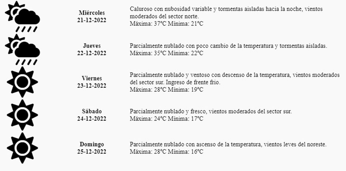 Miércoles: Caluroso con nubosidad variable y tormentas aisladas hacia la noche, vientos moderados del sector norte. Máxima: 37º. Mínima: 21º