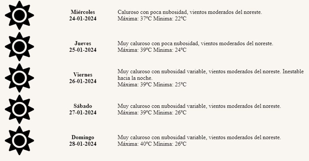 Para lo que resta de la semana, se esperan temperaturas elevadas que superarán los 39º, a partir del jueves, en que el tiempo estará muy caluroso, con vientos del noreste que harán aumentar la sensación térmica por el aporte de humedad, en tanto que la mínima será de 24º.