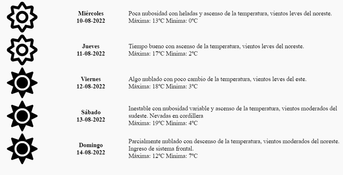 El pronóstico para el sábado indica "inestable con nubosidad variable y ascenso de la temperatura, vientos moderados del sudeste. Nevadas en cordillera", con una máxima estimada en 19º y la mínima de 4º.