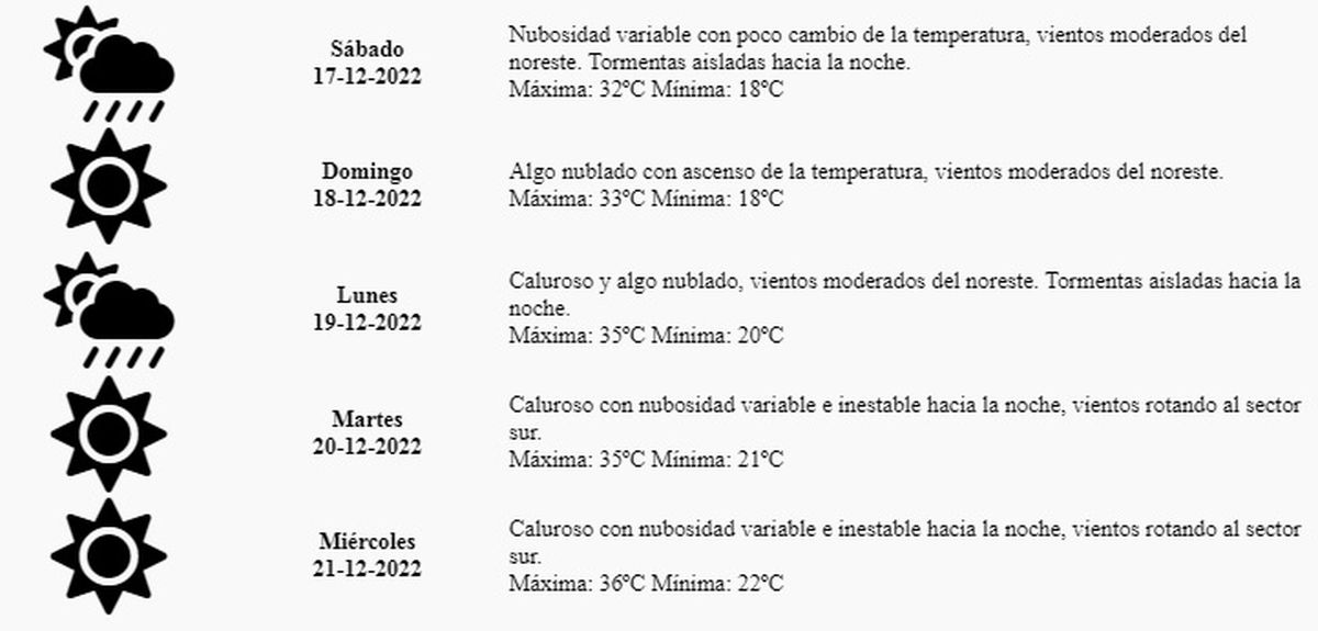 El pronóstico del tiempo para este sábado indica "nubosidad variable con poco cambio de la temperatura, vientos moderados del noreste. Tormentas aisladas hacia la noche" con una máxima probable de 32º y una mínima de 18º.