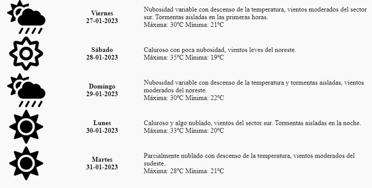 Sábado: Caluroso con poca nubosidad, vientos leves del noreste. Máxima: 35º Mínima: 19º