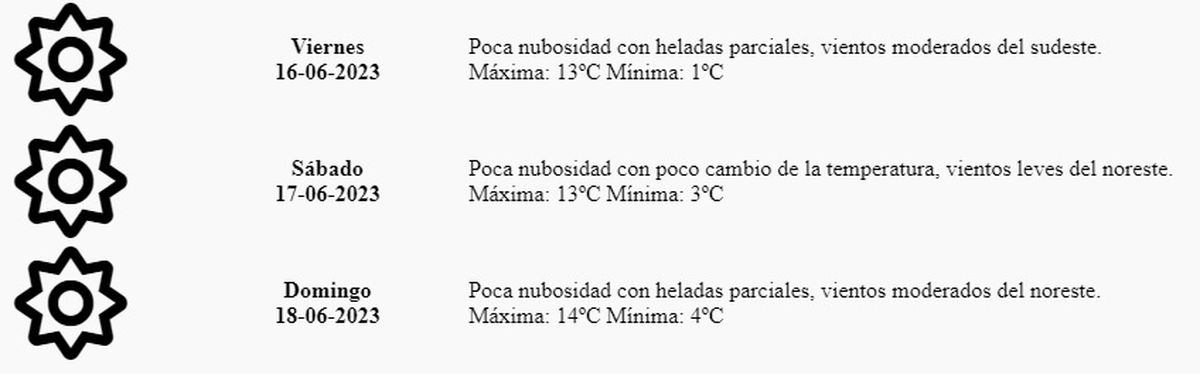 Viernes: Poca nubosidad con heladas parciales, vientos moderados del sudeste. Máxima: 13º Mínima: 1º