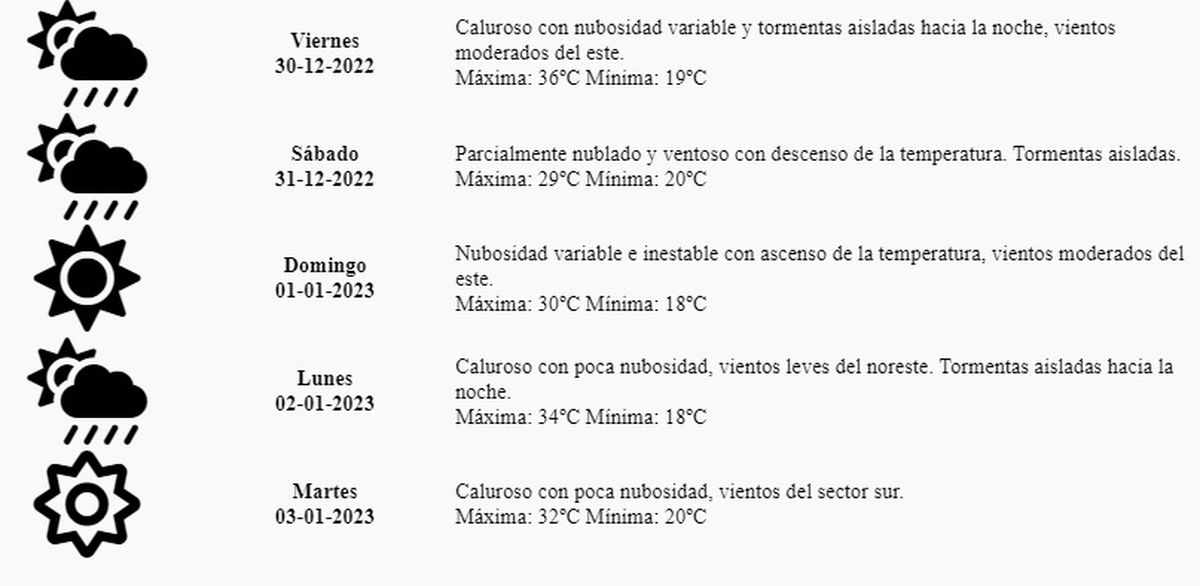 Viernes: Caluroso con nubosidad variable y tormentas aisladas hacia la noche, vientos moderados del este. Máxima: 36º Mínima: 19º