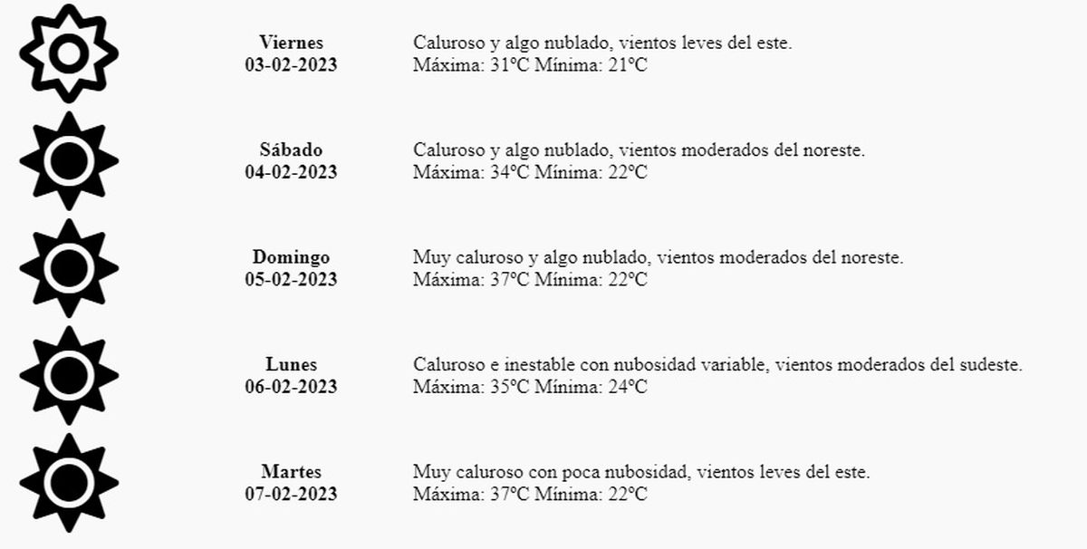 Martes: Muy caluroso con poca nubosidad, vientos leves del este. Máxima: 37º Mínima: 22º