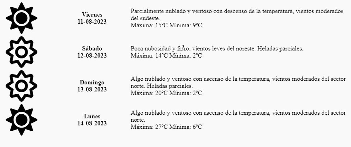 Sábado: Poca nubosidad y frío, vientos leves del noreste. Heladas parciales. Máxima: 14º Mínima: 2º