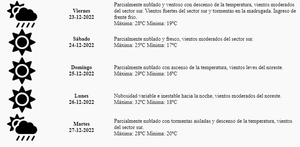 Viernes: Parcialmente nublado y ventoso con descenso de la temperatura, vientos moderados del sector sur. Vientos fuertes del sector sur y tormentas en la madrugada. Ingreso de frente frío. Máxima: 28º Mínima: 19º