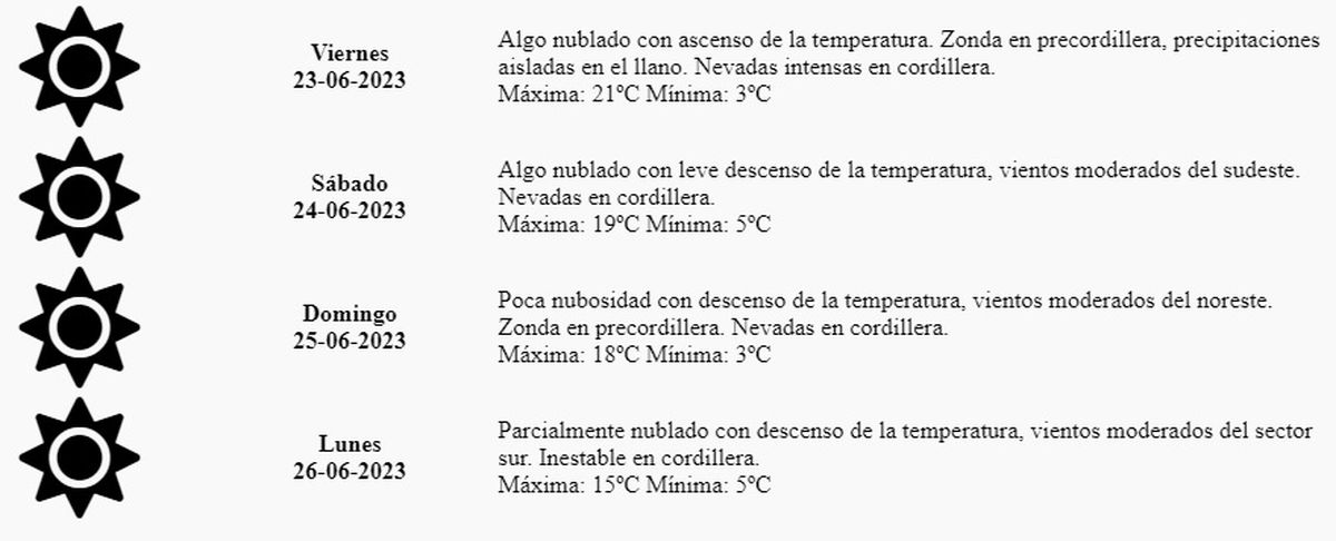 Domingo: Poca nubosidad con descenso de la temperatura, vientos moderados del noreste. Zonda en precordillera. Nevadas en cordillera. Máxima: 18º Mínima: 3º