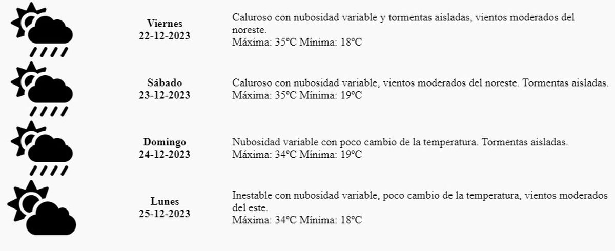 El panorama de inestabilidad tendrá continuidad el domingo, en que se anuncia poco cambio de la temperatura, tormerntas aisladas, por lo que se aconseja que la cena de Nochebuena se celebre con mesa adentro. La máxima llegaría a 34º y la mínima de 19º.