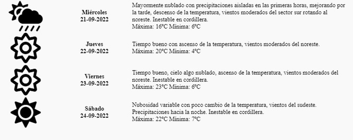 Miércoles: Mayormente nublado con precipitaciones aisladas en las primeras horas, mejorando por la tarde, descenso de la temperatura, vientos moderados del sector sur rotando al noreste. Inestable en cordillera. Máxima: 16º Mínima: 6º