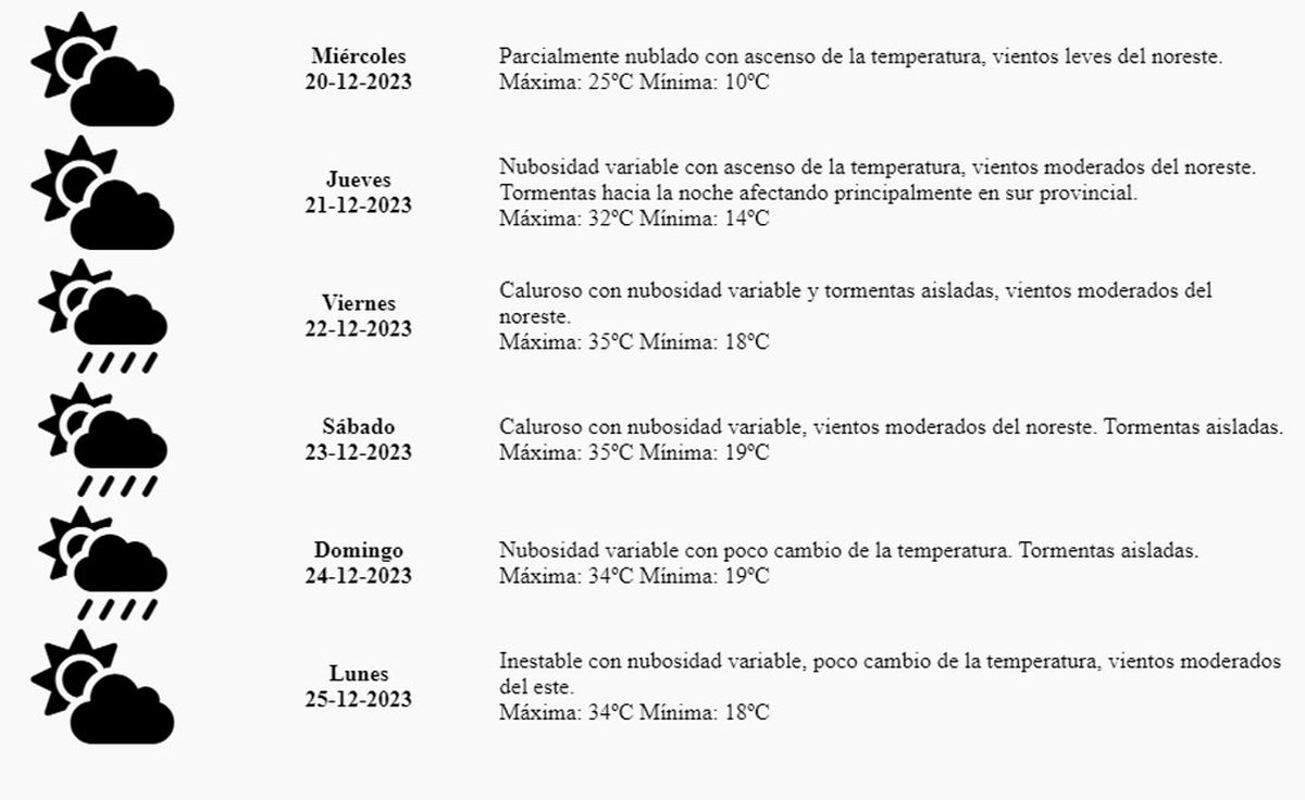 “El viernes habrá una mínima de 18º o 19º y una máxima de 34º, con la presencia de tormentas aisladas. El sábado la mínima será de 20º y una máxima de 33º, con el mismo escenario lluvioso por la tarde-noche”, puntualizó.