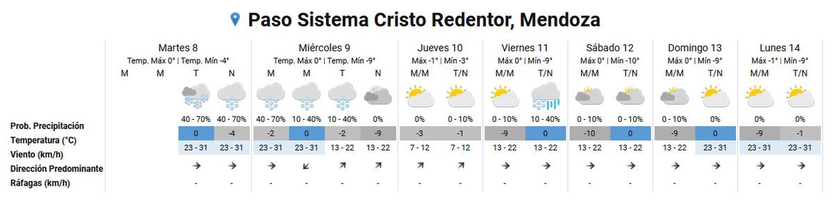 Debido a esto, el paso a Chile se mantuvo cerrado durante todo el martes y esperan que se habilite en el transcurso del miércoles, cuando el tiempo mejoraría, aunque todavía se espera que pueda caer alguna nevada débil.