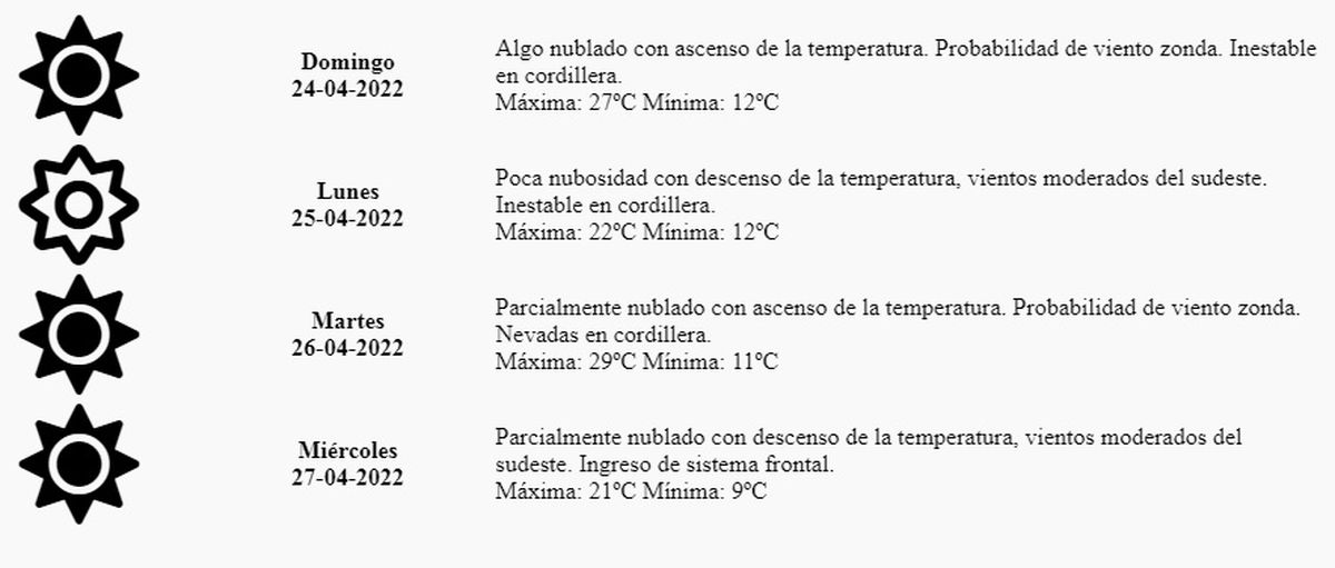 El pronóstico del tiempo para este domingo indica "algo nublado con ascenso de la temperatura. Probabilidad de viento zonda. Inestable en cordillera. Máxima 27º y mínima 12º.