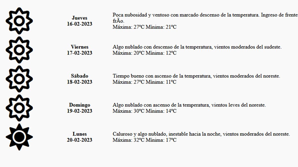 Según el sitio de Contingencias Climáticas, en este viernes habrá una temperatura máxima de 20 grados y una mínima de 12, con cielo algo nublado, por la entrada a la provincia de un frente frío. Sin embargo, el Servicio Metereológico Nacional sitúa esa máxima incluso mucho más baja, en torno a los 15 grados.