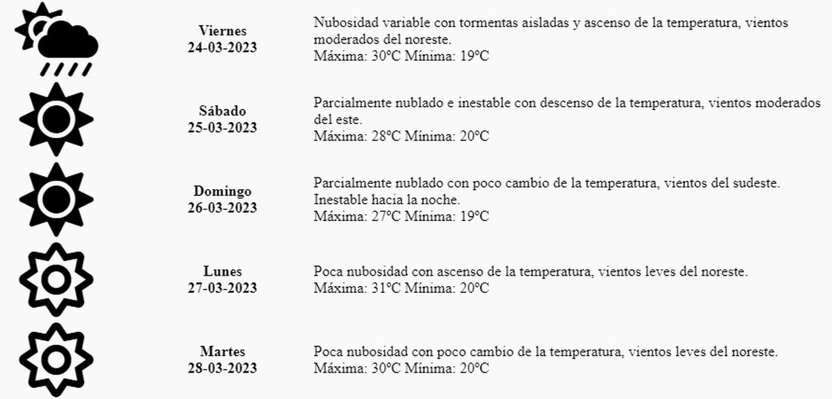 Viernes: Nubosidad variable con tormentas aisladas y ascenso de la temperatura, vientos moderados del noreste. Máxima: 30º Mínima: 19º
