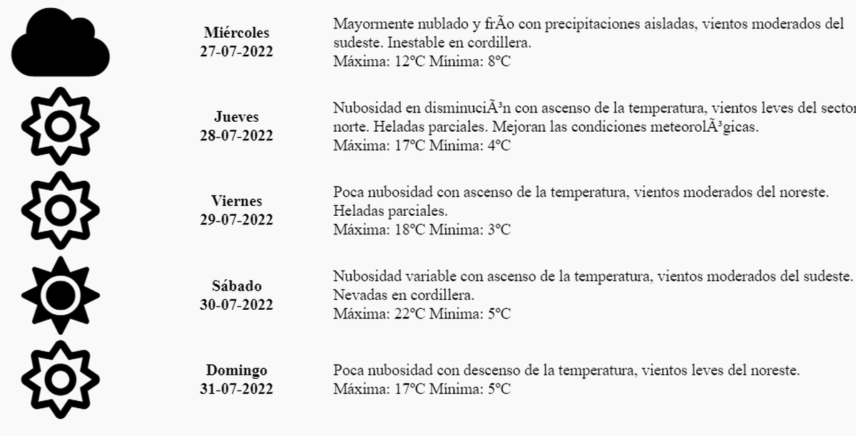 "Nubosidad en disminución con ascenso de la temperatura, vientos leves del sector norte. Heladas parciales. Mejoran las condiciones meteorológicas", con una máxima de 17º y una mínima de 4º.