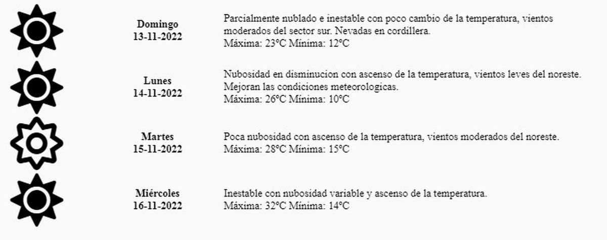 El pronóstico del tiempo para este domingo indica "parcialmente nublado e inestable con poco cambio de la temperatura, vientos moderados del sector sur. Nevadas en cordillera", con una máxima probable de 23º.