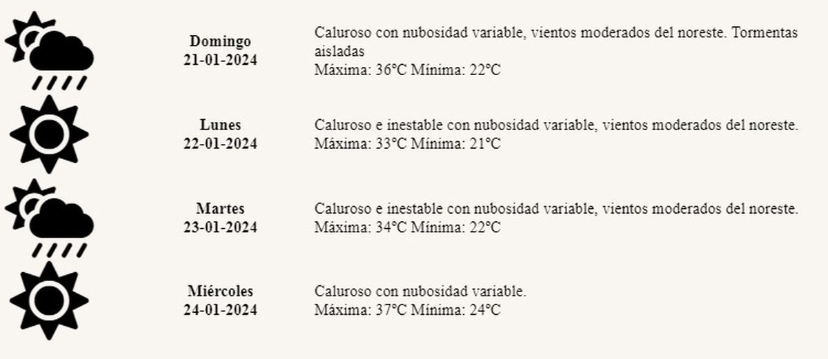 Domingo: Caluroso con nubosidad variable, vientos moderados del noreste. Tormentas aisladas Máxima: 36º Mínima: 22º