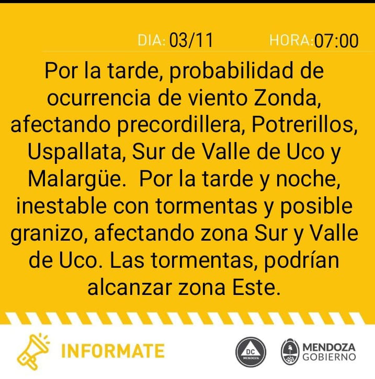 Según la información aportada por Contingencias Climáticas Mendoza, para este domingo se espera cielo algo nublado con ascenso de la temperatura. Inestable, viento Zonda en precordillera y precipitaciones débiles en cordillera. Tormentas hacia la noche y posible caída de granizo en el sur provincial. La máxima alcanzaría los 31º.